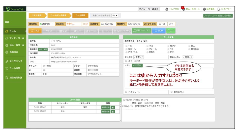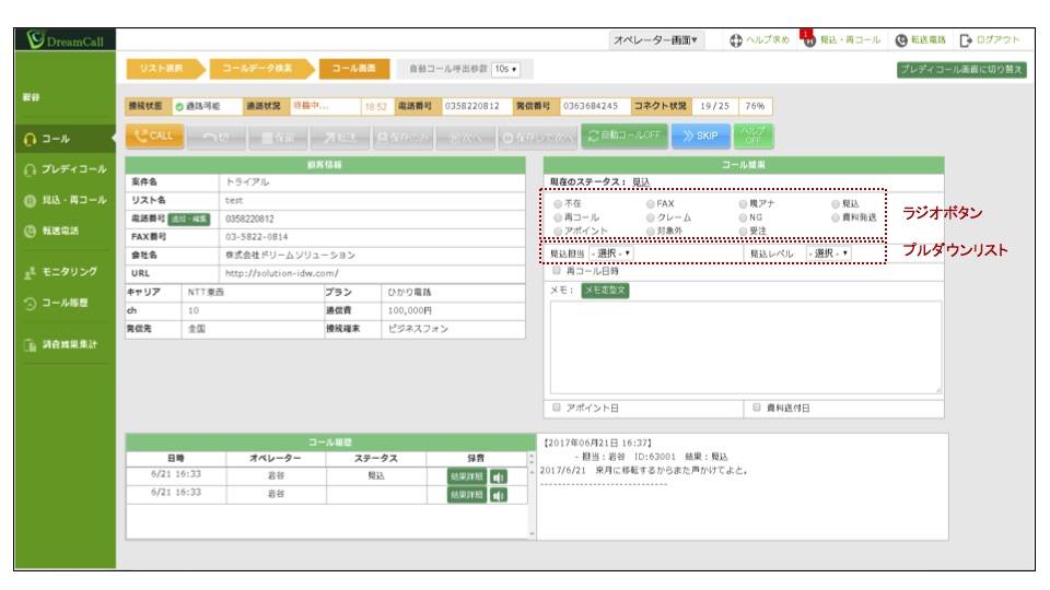 たったこれだけ! 百聞は一見にしかず! こちらがその操作画面です。 これまでCTIを使ったことがある方なら、「CTIってこんなにシンプルだっけ?」と思われるはず! ヒアリング結果やコール結果入力の項目は、 アポ・不在・現アナ・再コールなど、あらかじめ項目を登録しておくことで、