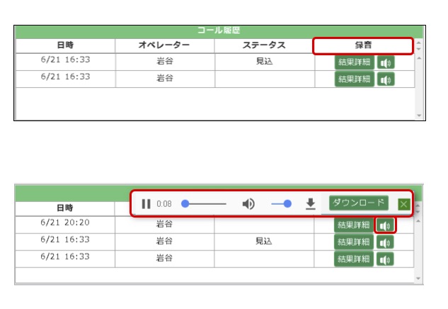 その中で特に重要なのは「アポ」や「見込み」というコール結果です。 この場合はコール結果をより詳しく入力する必要があるので、メモ入力欄が用意されています。 でも、キーボード入力に不慣れな場合は、紙などにメモを取っておけばOK! あとからメモを元に他のスタッフがキーボードで入力をすれば、効率的な運用ができます。 また、通話録音にも対応しているので、録音データの聞き起こしも可能です。 下記のように、録音したものをその場で再生することも、必要に応じて音声データをダウンロードすることもできます。 これなら「パソコンをほとんど使ったことがない!」という方も、少し練習をすればすぐに使えるようになるので、安心して業務を任せることができますね!