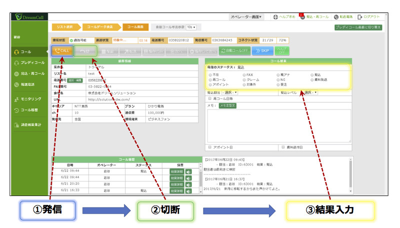 発信先リストの管理などはSV(管理者)が行うため、オペレーターはパソコンを立ち上げてシステムへログインするだけ。 ドリームソリューションが提供する「ドリームコール」は、基本的には3ステップだけの「クリックコール」です。 主な手順は、