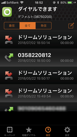 外出中の営業マンが利用できるということは、自宅はもちろんカフェやコワーキングスペース、シェアオフィスなどで仕事をしている人も使えるということです。▼発着信履歴画面です。